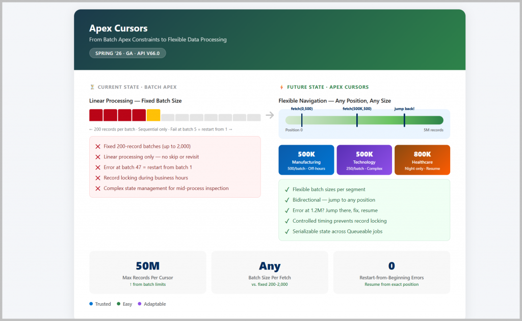 | Future State | ✅ Cursor position tracking enables precise error recovery ✅ Fetch exactly the records your process needs per iteration ✅ TransientCursorException allows retry without full restart ✅ Same security model as Batch Apex (sharing rules, FLS respected) ✅ Governor limit visibility via Limits.getApexCursorRows() ✅ Controlled processing prevents user-facing locking issues | ✅ Simple API: getCursor(), fetch(), getNumRecords() ✅ Built-in state management (cursor position) ✅ Lower barrier to entry for async processing ✅ Dynamic batch sizing based on runtime conditions ✅ Non-linear processing (skip ranges, revisit records) ✅ Explicit cursor position management | ✅ Cursors serialize and pass between Queueable jobs ✅ @AuraEnabled support for LWC integration ✅ Mix and match with other async patterns ✅ Process up to 50 million records per cursor ✅ Adapt processing strategy based on runtime metrics ✅ Resume from any position after interruption |