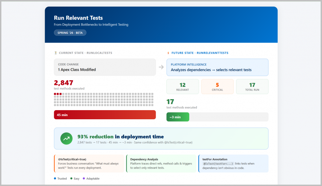 Spring ’26 introduces a new test level option: RunRelevantTests. When you deploy, the platform analyzes your changes and intelligently determines which tests actually validate the code you’re deploying.