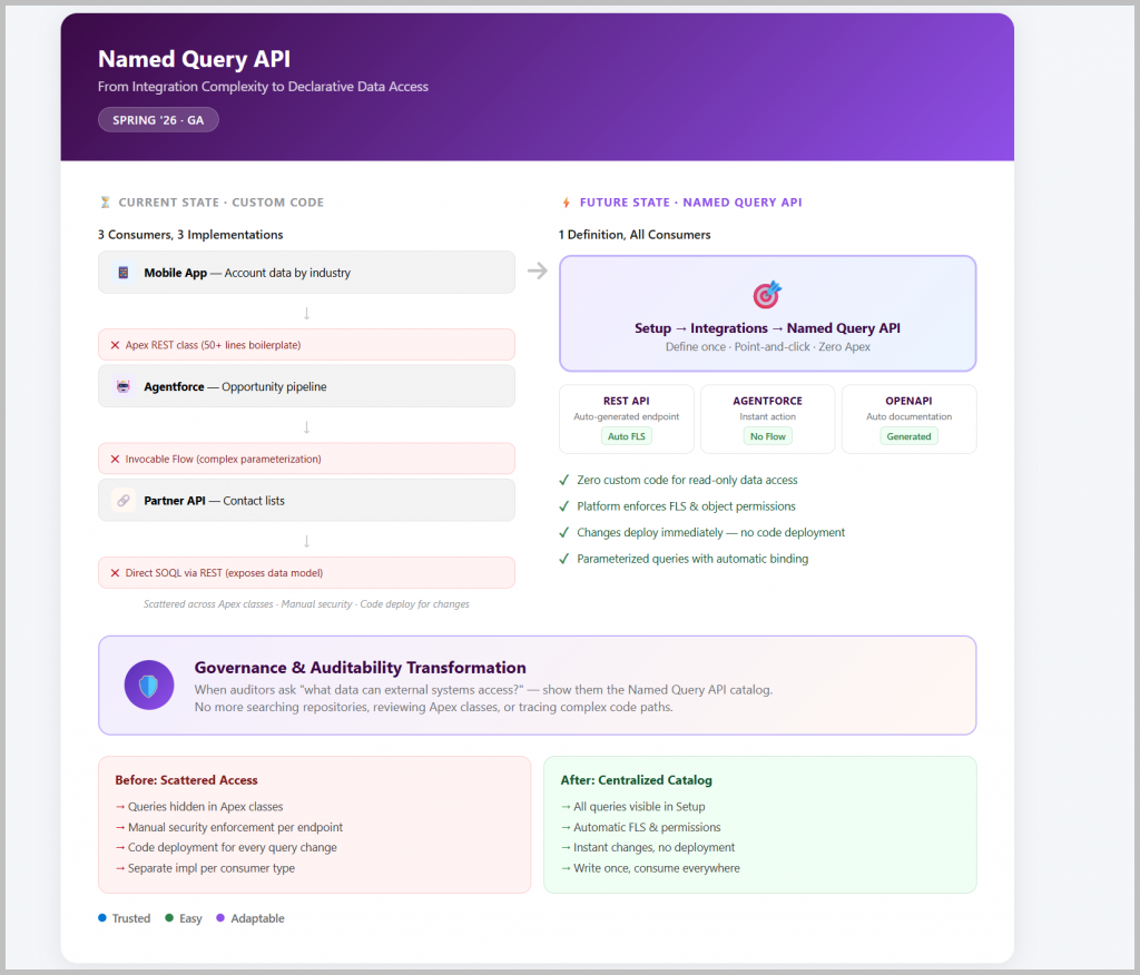 Named Query API (GA in Spring ’26) lets you define SOQL queries once in Setup, then automatically expose them as REST endpoints and Agentforce actions: