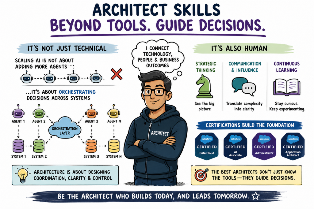 Finally, I’m particularly interested in how we scale AI beyond single agents. Sessions like How to Go from Single Agents to Multi-Agent Orchestration highlight that scaling is not about adding more agents—it’s about orchestrating decisions across systems. At the same time, sessions like Talk Like an Architect and Accelerate Your Career with Salesforce Certifications reinforce that architecture is not just technical. Certifications build the foundation, but real growth comes from thinking strategically, communicating tradeoffs clearly to business stakeholders, and continuously learning through experimentation. In the AI era, the best architects won’t just know the tools—they will know how to guide decisions.