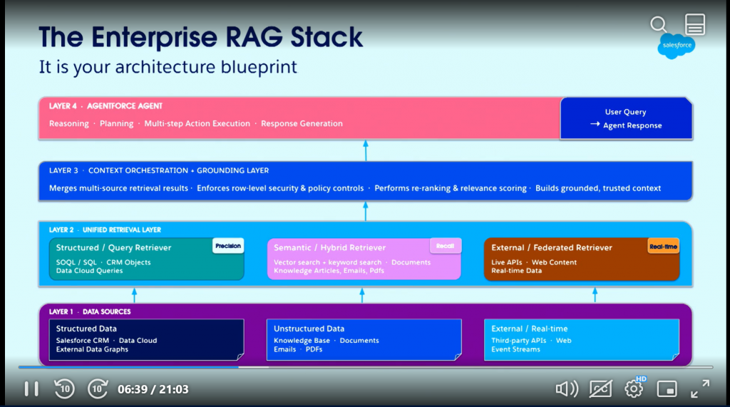 The next layer is what I consider the real differentiator—context architecture. Sessions like Data 360 — From Foundation to AI Innovation, Scale Trusted AI Adoption with Salesforce and AWS, and Metadata and Data Quality: Building the Foundation for AI highlight a common misconception: having clean data is not enough. The real challenge is building a system of orchestration that can pull the right data across systems, prioritize it, and apply role-based context so agents can make meaningful decisions. That’s the difference between having data and having usable context—and most organizations are still figuring this out.