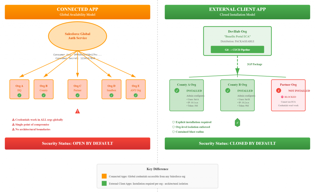 Key Takeaway: ECAs provide the flexible, auditable, org-level security that government agencies need to meet FedRAMP, NIST, and ATO requirements—replacing the rigid, globally-available Connected App model with installation-based access control.