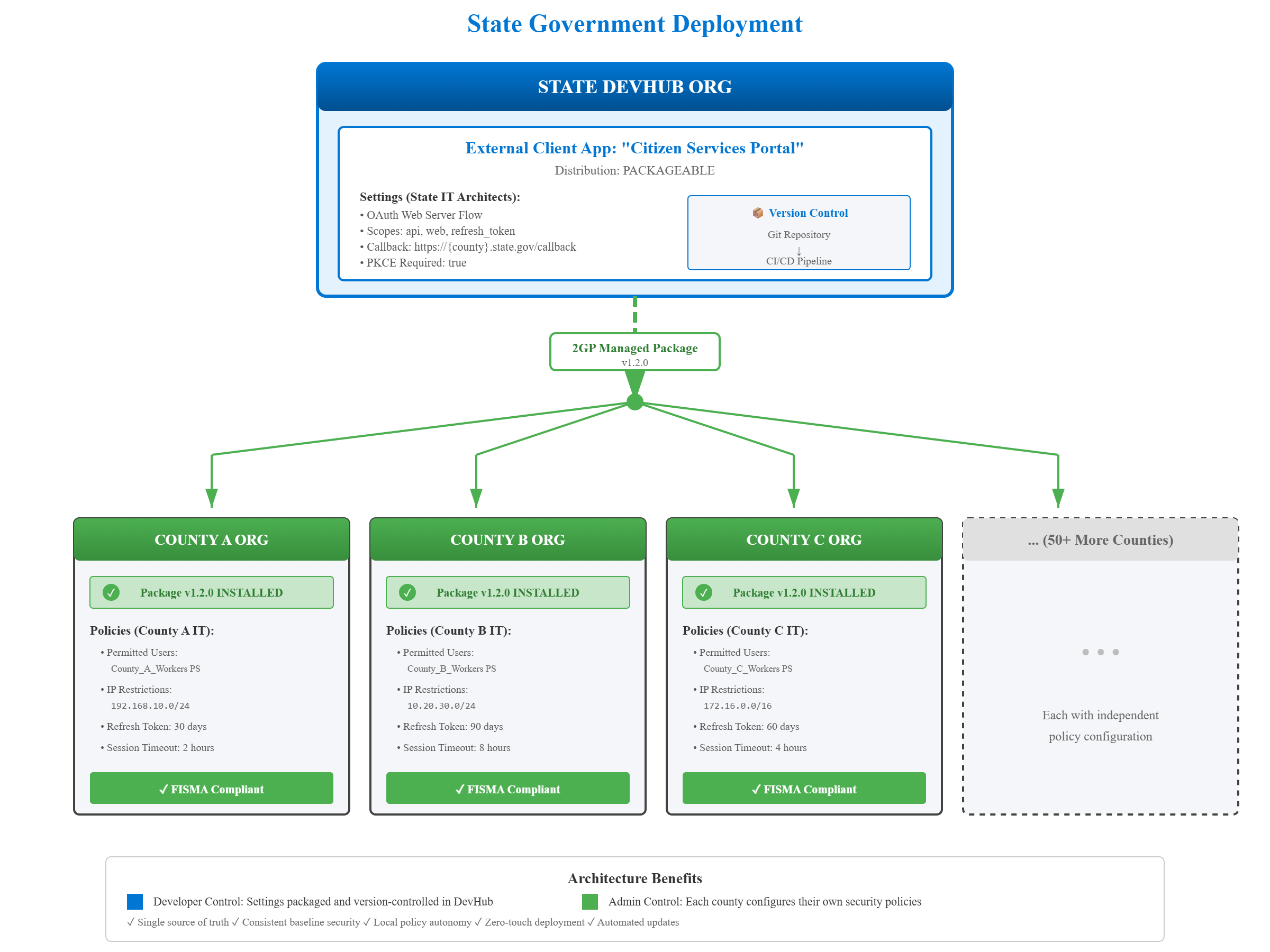External Client Apps support two primary deployment models depending on your organizational structure. For single-org deployments, you create an ECA with distribution state set to “Local”—this is ideal for agencies with one production Salesforce org integrating with external systems like benefits portals or constituent management platforms, where the ECA is developed, configured, and managed entirely within that single org with no need for packaging or distribution. For multi-org deployments (the more common scenario in government), you set distribution state to “Packageable” and leverage a DevHub org to maintain the ECA as a 2GP managed package—this pattern works perfectly for state governments with headquarters plus regional offices, federal agencies with field locations, or multi-agency collaborations where you need consistent OAuth settings across all orgs but independent security policies per location. The multi-org approach gives you the best of both worlds: developers maintain OAuth flows, scopes, and callbacks in version-controlled metadata deployed via package, while each subscribing org’s administrators independently configure their permitted users, IP restrictions, refresh token policies, and session timeouts based on their specific security requirements and risk profiles. This architectural flexibility means whether you’re managing a single federal agency or coordinating across dozens of state and county entities, ECAs scale to your governance model.