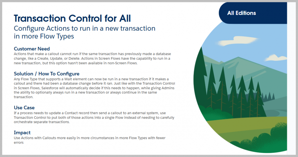 How is this beneficial to you: This will be a great lift for architects who were constrained by call outs and integrations due to time-out issues. Now, with the ability to configure new transaction contexts, you can easily perform call-outs and update objects, allowing for more time to track responses and update errors with integrations.