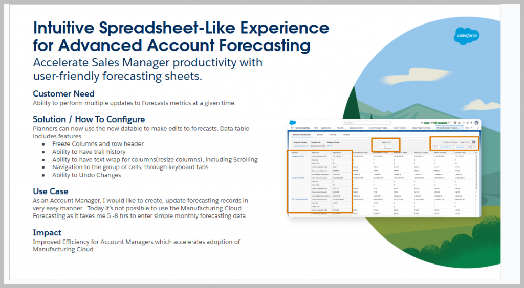 How is this beneficial to you: This is a feature that manufacturers have to look at and reevaluate the use case for the manufacturing cloud. This will make it easy to do account-level forecasting using Manufacturing Cloud.