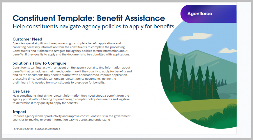 How is this beneficial to you? Public sector agencies often have multiple documents required for benefit applications. Agentforce can help by leveraging this use case, enabling agents to assist constituents in obtaining the necessary documents for benefits.